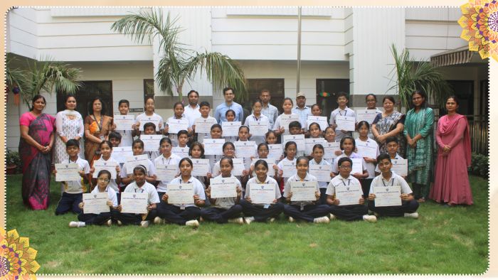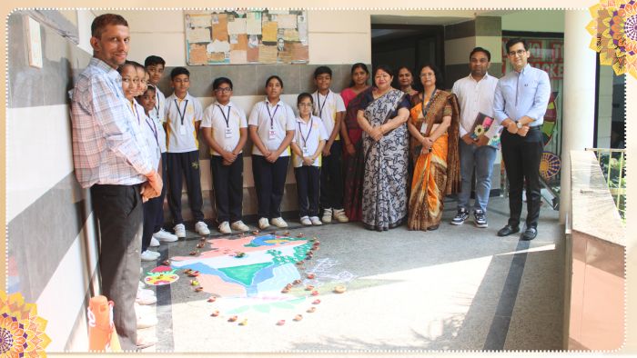 After the pooja, selected students from Classes VI to VIII, along with their House Leaders, participated in a vibrant Rangoli Competition. Their creative and colourful designs beautifully captured the essence of the festival. The results were as follows: