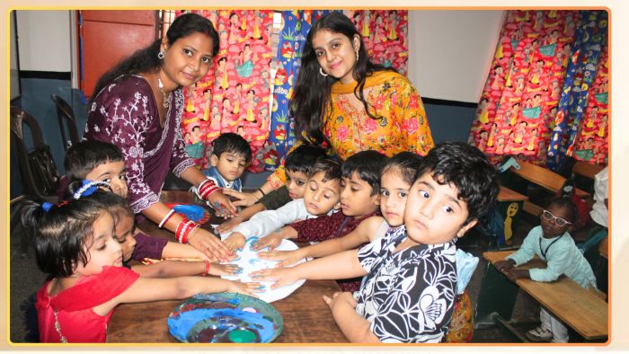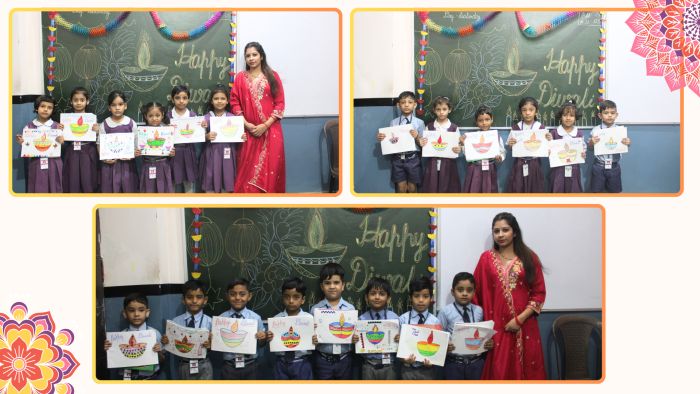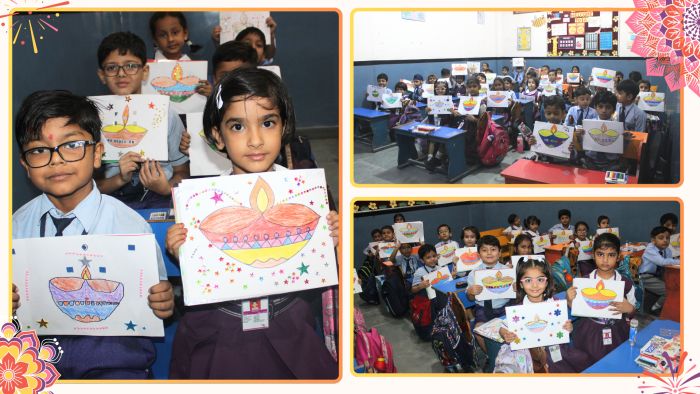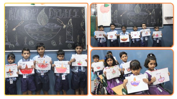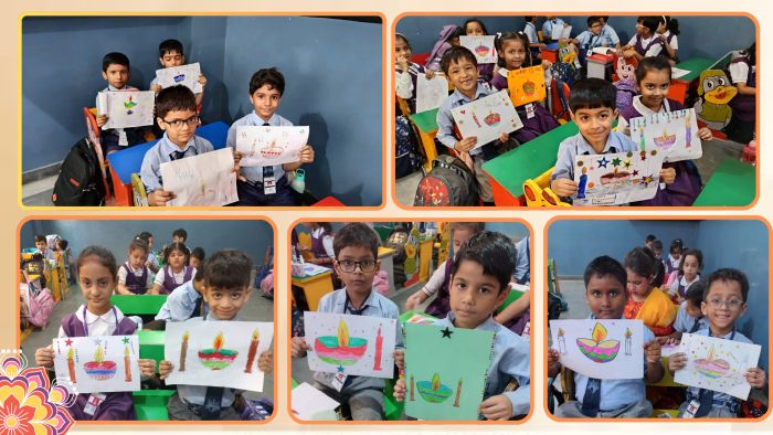 In Nursery class, tiny tots showcased their artistic talent by preparing a huge paper lamp (Diya) decorated beautifully with their thumb and palm impressions. Students of classes KG, I and II also participated enthusiastically in diya decoration activities, illuminating the school with lights and colours.
